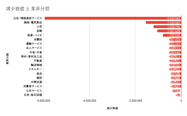 以下は検索流入数の差分をとり、マイナスになった数値のみの合計を業界ごとに表したものです。業界全体で見ると検索流入数が伸びている「広告・情報通信サービス」も含んだうえで、Webサイトごとに見ていくと、Googleのアルゴリズムアップデートなどの影響に受けたのか、検索流入数には伸びたところばかりではなく、アップデートに対応できなかったサイトは検索流入数が下がったということがわかります。