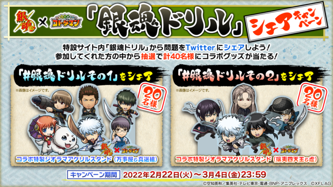 本コラボでは、「坂田銀時(白夜叉)」をはじめとする“攘夷四天王”や「神威(夜兎族)」などの人気キャラクターが新たに登場します。また、本日2月22日(火)よりコラボ紹介PVを公開するほか、TVアニメ『銀魂』にまつわるクイズを出題する「銀魂ドリル」が特設サイト内に登場します。さらに、「銀魂ドリル」に参加し、問題をTwitterでシェアした方の中から抽選で、コラボ描きおろしイラストを使用したオリジナルグッズ「コラボ特製ジオラマアクリルスタンド」が当たるTwitterキャンペーンも実施します。