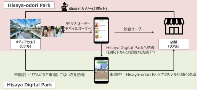 Hisaya-odori Parkの来園者は、メディアヒロバ※7 内の特設エリアで配布されるQRコードを利用し、Hisaya-odori Parkにある飲食店のメニューをモバイルオーダーすることができます。オーダーされたフードやドリンクはロボットによりメディアヒロバ内の注文者へデリバリーされます。ロボットからの受け取り方法は、「Hisaya Digital Park」にアクセスすることで確認することができます。
