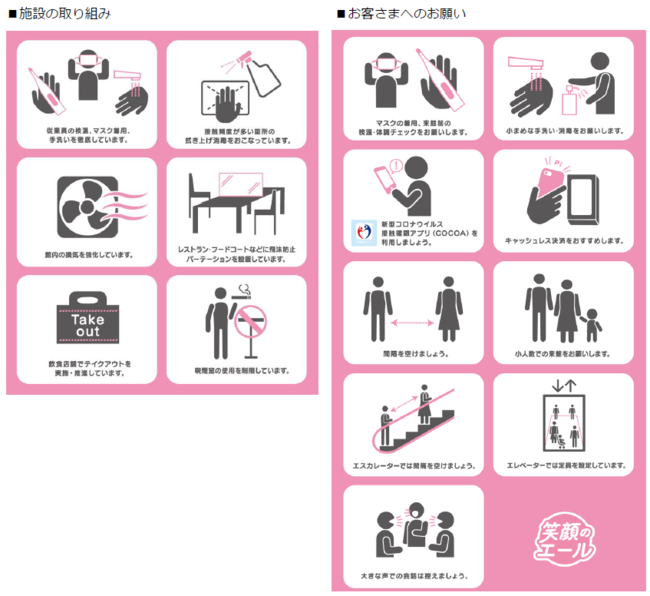 三井不動産グループが運営する商業施設では、新型コロナウイルス感染拡大防止のため下記をはじめとした様々な取り組みを実施しております。
