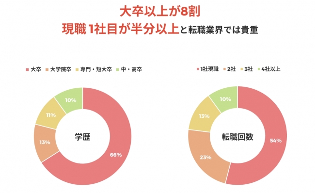 上場企業に勤務している方が7割ほど存在し、転職意欲の強い若手優秀層が多い傾向にあります。