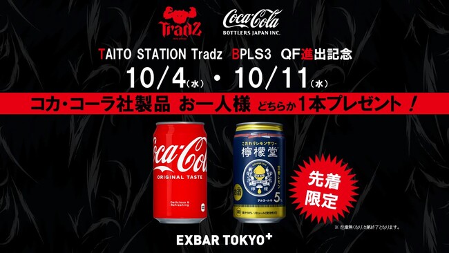 TradzのBEMANI PRO LEAGUE -SEASON 3- beatmania IIDX クォーターファイナル進出を記念してBPL期間中の試合配信のある毎週水曜日にパブリックビューイングを開催しているEXBAR TOKYO plusにて10/4(水)・10/11(水)の2日間、コカ・コーラ社製品プレゼント企画を実施いたします。