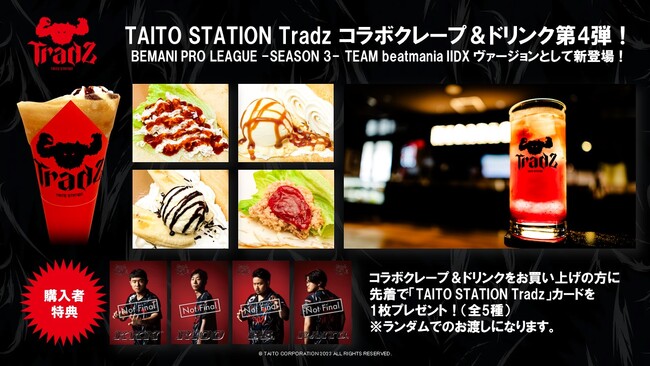 大変多くの反響をいただいているTradzコラボクレープとドリンクの第4弾が、BEMANI PRO LEAGUE -SEASON 3- TEAM beatmania IIDXヴァージョンとして好評発売中です。