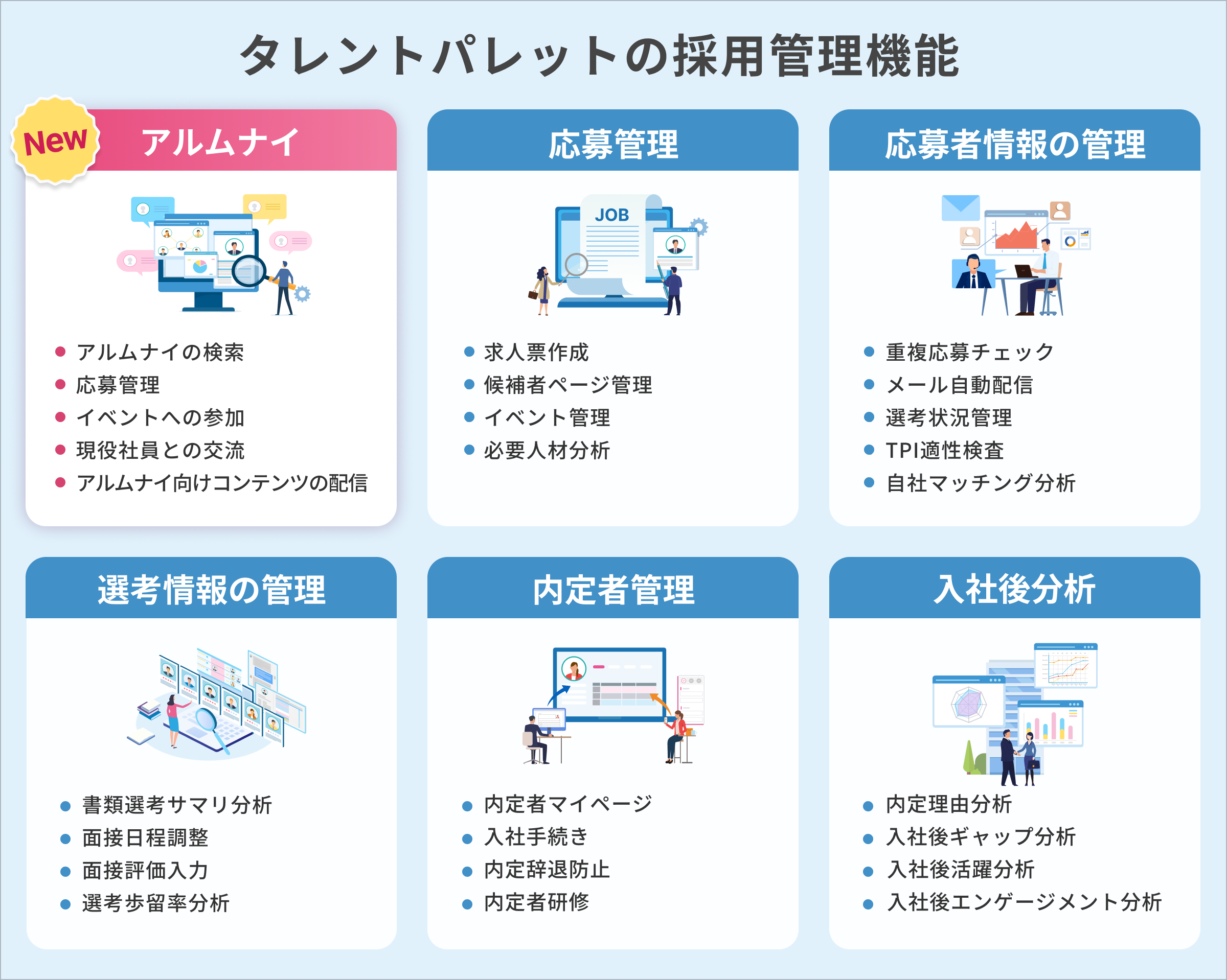 タレントパレットの採用管理システムは、新卒採用、中途採用、アルムナイ採用などの多様な採用活動から入社時の手続きまでを一元管理し、採用に関連する一連の業務の効率化・高度化を支援します。また、人事情報、経歴、スキル、マインド(適性)、社員の希望や想い、日々のモチベーションやエンゲージメントなどの人材データと連携することで人材の最適配置や育成を実現します。