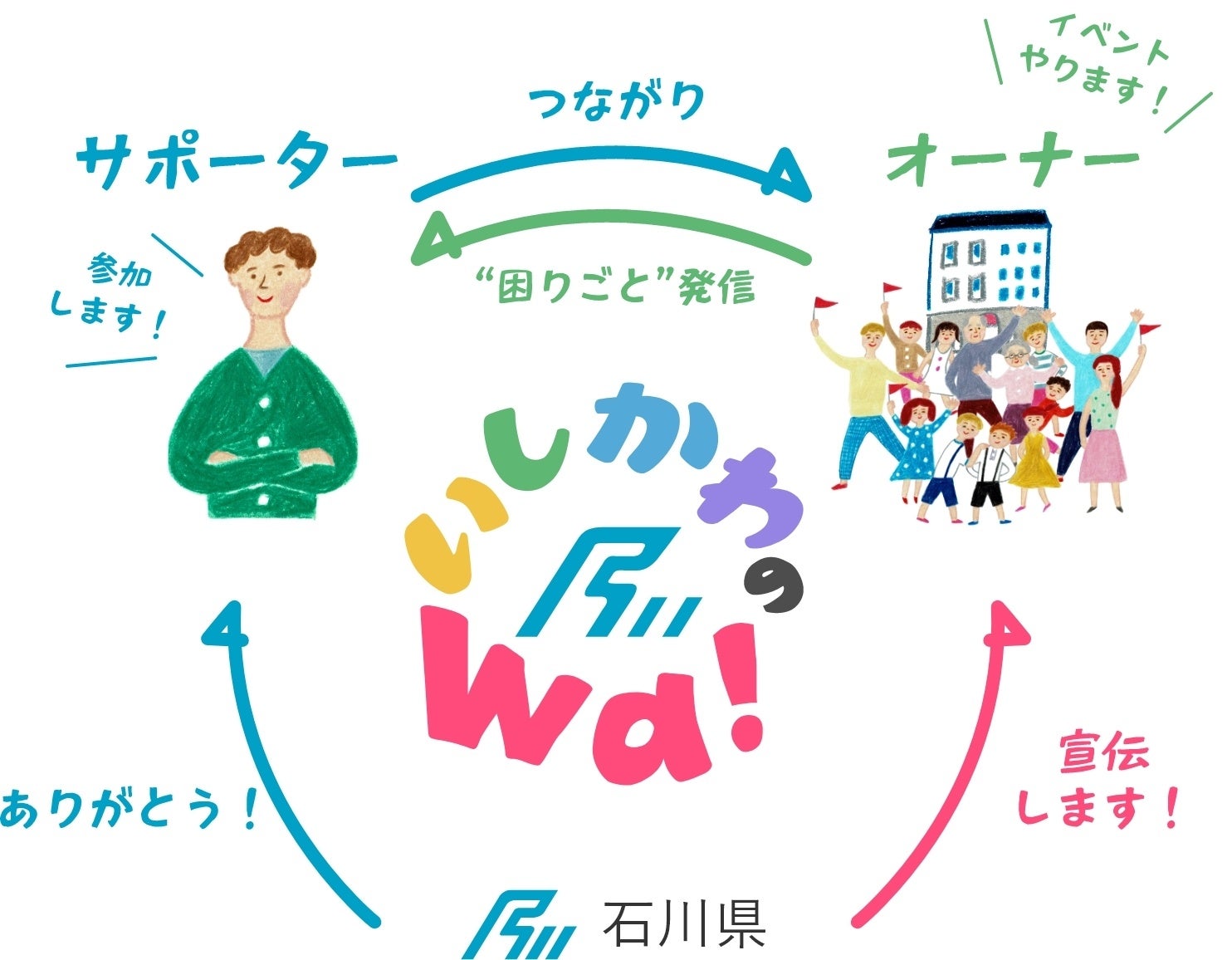 「いしかわのWa!」は、地域と人がつながるための関係人口ポータルサイトです。震災からの復興に取り組む能登をはじめ、石川県の地域団体などの“困りごと”に、全国の皆さんが“関わり”を通じて寄り添い、支え合う「輪」を広げます。あなたの“関わり”が石川県の力になります。
