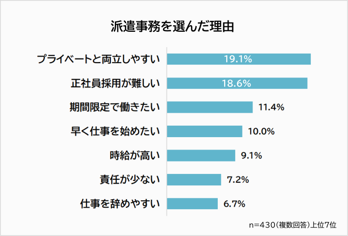 派遣事務をしたことがある430人に「派遣事務を選んだ理由」を聞いたところ、1位は「プライベートと両立しやすい(19.1%)」、僅差の2位は「正社員採用が難しい(18.6%)」となりました。3位「期間限定で働きたい(11.4%)」が続きます。