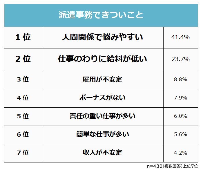 派遣事務できついこと」の圧倒的1位は「人間関係で悩みやすい(41.4%)」でした。2位は「仕事のわりに給料が低い(23.7%)」です。