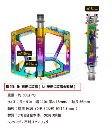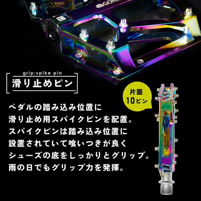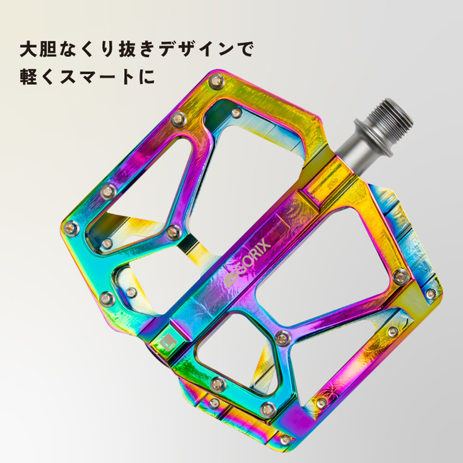 ワイド幅に薄型で軽量、そして滑らかな回転が特徴のフラットペダルです。綺麗で美しいオイルスリックカラーは自転車の印象を変えるので機能面だけでなくカスタマイズの一歩にも最適です。