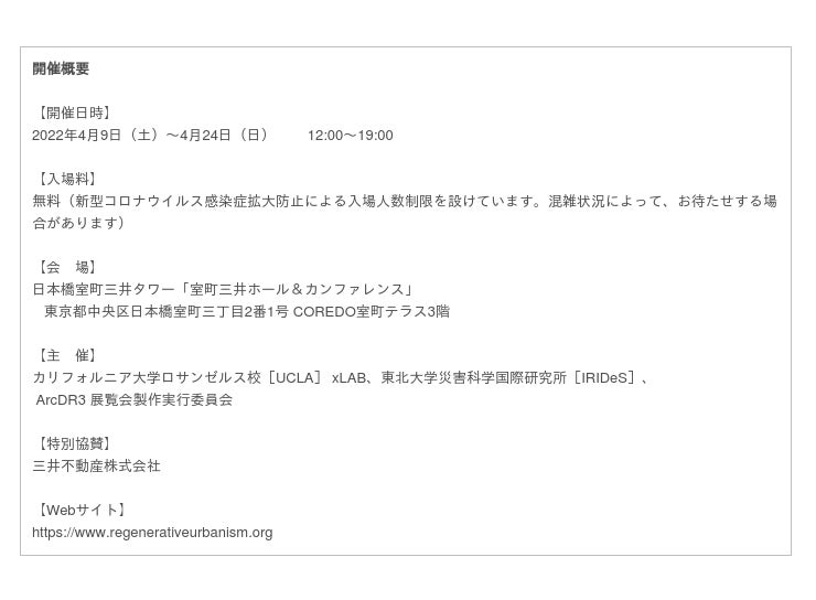 UCLAをはじめとした環太平洋の11大学と「リジェネラティブ・アーバニズム展—災害から生まれる都市の物語」を開催します。なお当プロジェクトは、当社が東日本大震災以降継続している東北地方の情報発信・交流の拠点となる「わたす日本橋(※)」と連携し、震災復興も含めた取り組みとして展示会、シンポジウム、オンライン交流会を実施しています。