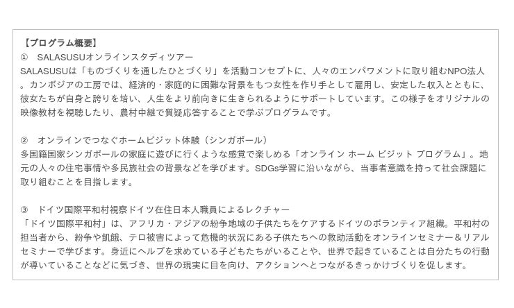 「日本以外の国で行われているSDGsの活動を知る良い機会になりました。子どもたちにとって体験する機会がないこの2年、オンラインだからこそ有意義な会で忘れられない学びになったと感じています」