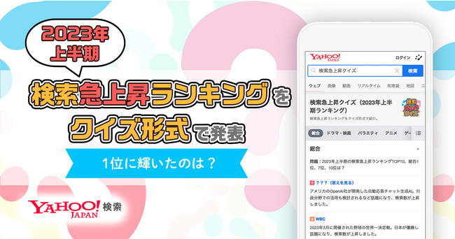 ヤフー株式会社(以下、Yahoo! JAPAN)は本日、2023年上半期に検索数が急上昇した、さまざまなジャンルの人物や作品などのランキングをクイズ形式で発表する「検索急上昇クイズ 2023年上半期ランキング」(以下、本企画)を公開しました。「Yahoo!検索」で「検索急上昇クイズ」と検索すると、総合ランキングおよび全7カテゴリー22部門の検索急上昇ランキングやクイズを確認できます。