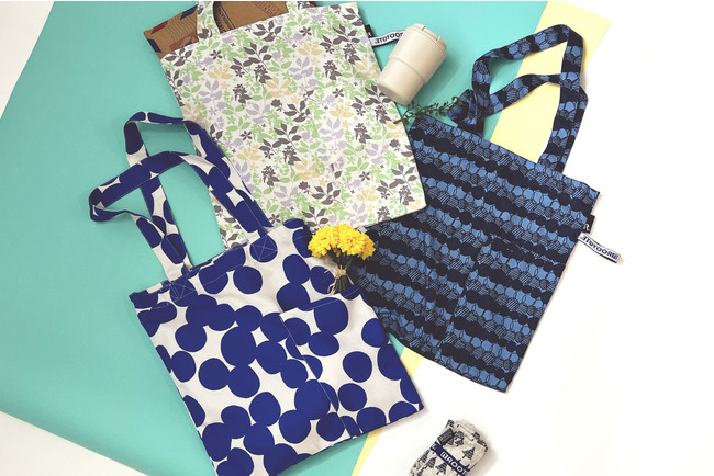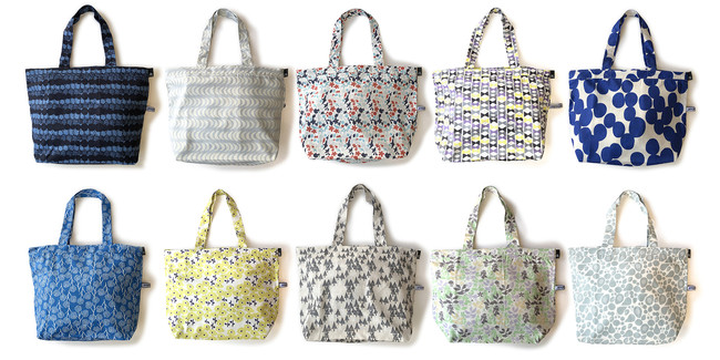 PT.ミディアムファスナー REPET-A 1,760円(6493 01 Honeycomb、02 Peel、03 Garden、04 Ribbon、05 Bubbles)PT.ミディアムファスナー REPET-B 1,760円(6494 01 Cotton Flower、02 Flower、03 Forest、04 Leaf、05 Fruits)-共通仕様- サイズ:W48×H34×D15cm(収納時:約W8×H15cm)持ち手:55cm 素材:再生ポリエステル ポケット:外側1箇所 メイン開閉:ファスナー ※発売中