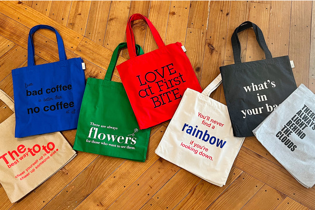 語録やもじり言葉など、キラッと光るウイットに富んだ言葉をタイポグラフィで表現しました。見た目も楽しいカラフルでポップなエコトート。幅広マチで荷物をたっぷり収納できるボックス型です。