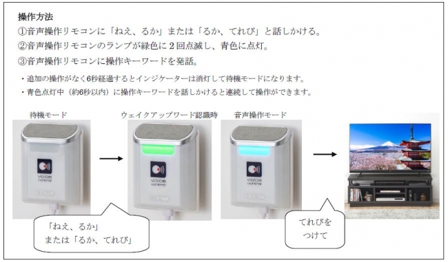 高性能の音声認識回路とマイクを内蔵した音声操作リモコンが、聞き取った指示内容を赤外線コードに変換した信号としてテレビに送り、操作できます。そのため、スマートスピーカー使用時と比較して、音声認識から操作までの応答が速く、簡単に操作できます。音声で操作ができるため、買い物帰りや乳幼児連れで両手が塞がっているとき、リモコンが見当たらないときといった様々な利用環境に対応できます。音声操作モードを起動するウェイクアップワードの「ねえ、るか」または「るか、てれび」に続き、予め設定された27種類の操作ワードを音声操作リモコンに向かって発話するだけで、電源のオン・オフやチャンネル変更、音量の調整などを手軽に操作できます。また音声操作モード中(※1)は連続して操作が可能です。