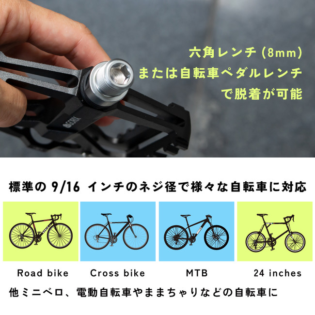 六角レンチ(8mm)、または自転車ペダルレンチで脱着が可能です。