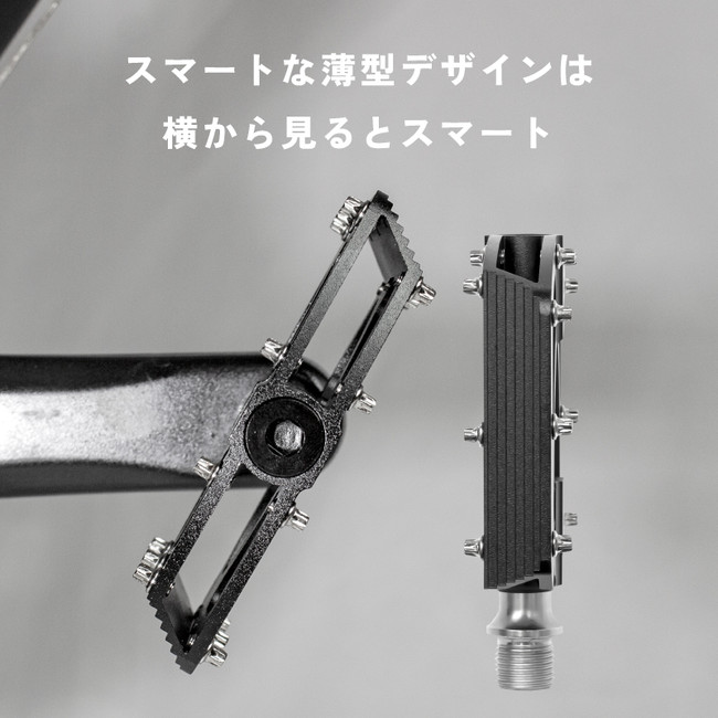 幅広い形状は靴との接触部分が広くしっかりと足をホールドし漕ぐ力を逃しません。