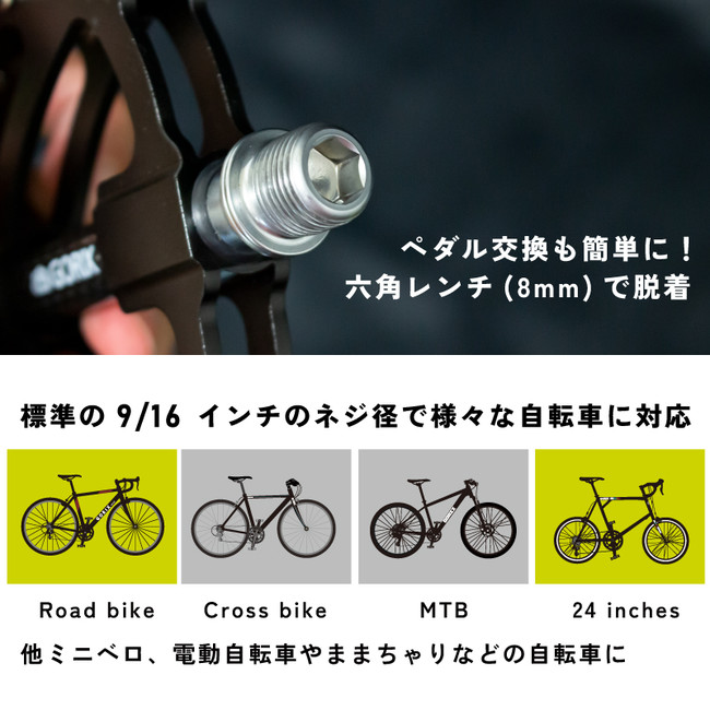 六角レンチ(8mm)で交換可能なのでペダルの取り付けも簡単になります。