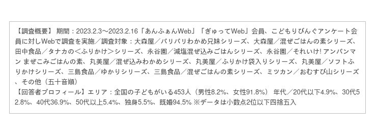 2023年2月に実施した全国のママ・パパが選ぶ「子どもの好きなふりかけ」、利用率第1位は「のりたま」などで知られる「丸美屋/ふりかけ袋入りシリーズ」、満足度第1位は「三島食品/ゆかりシリーズ」、リピート率第1位も「三島食品/ゆかりシリーズ」となりました。
