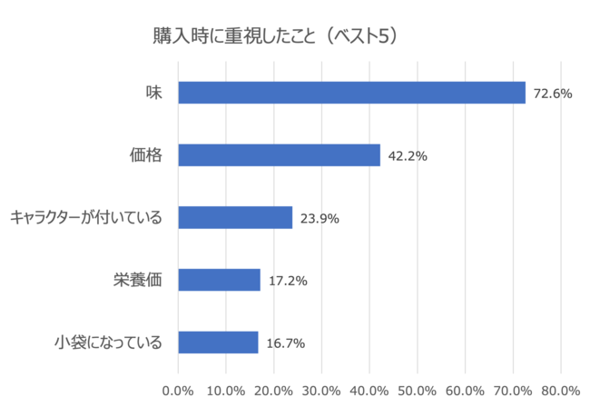 子どもの好きなふりかけの購入時に重視したことは「味」 が72.6%と最多、続いて「価格」「キャラクターが付いている」「栄養価」「小袋になっている」でした(複数回答、下記グラフ)。