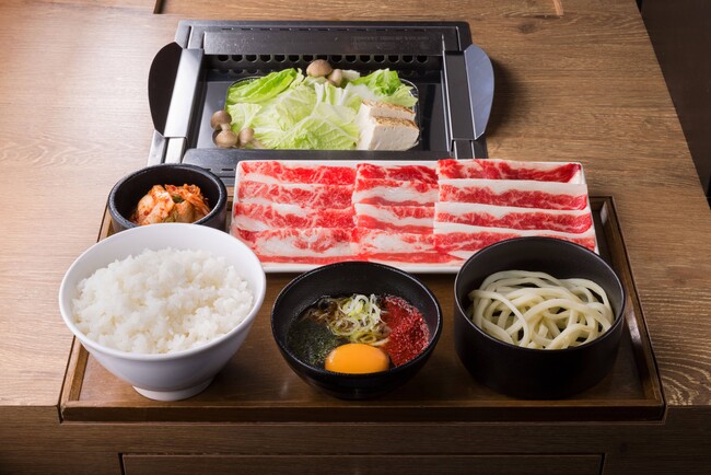 ・「国産牛すき焼セット」(野菜盛り・ごはん・キムチ・生卵・うどん付)1,400円