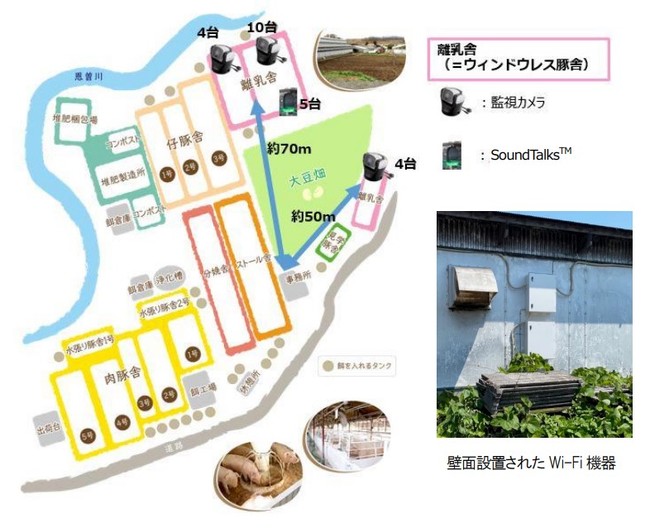その通信を利用して、監視カメラ18台によりウィンドウレス豚舎(3棟)内を遠隔監視し、そのうち1棟は「SoundTalksTM」モニター5台による咳音検知と温湿度モニタリングも併せて行い、離乳豚の健康維持を図るとともに、農場の生産性向上・出荷品質向上に取り組んでいます。