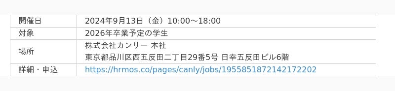 店舗経営を支える世界的なインフラの創造を目指す株式会社カンリー(所在地:東京都品川区、代表取締役:辰巳 衛,秋山 祐太朗)は、9月13日(金)に26卒の学生を対象とした1dayインターンを開催することをお知らせいたします。