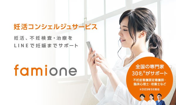 妊活コンシェルジュ「ファミワン」 (https://lp.famione.com/)は、妊活に取り組む夫婦を支える、LINEを活用したパーソナルサポートサービスです。LINEのアカウント登録をすることで専門のチェックシートが届き、その入力内容を分析し、あなたの状況に合わせたアドバイスを行います。