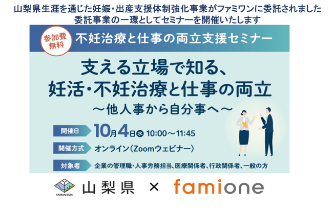 「子どもを願うすべての人によりそい 幸せな人生を歩める社会をつくる」をビジョンに掲げ、LINEを活用した妊活コンシェルジュサービス「famione(ファミワン)」 https://lp.famione.com/ を提供する株式会社ファミワン(本社:東京都渋谷区、代表取締役:石川勇介、以下当社)は、山梨県「生涯を通じた妊娠・出産支援体制強化事業」を委託されました。事業の一環として山梨子育て支援局・山梨産業保健総合支援センターが主催する2023年10月4日(水)開催の不妊治療と仕事の両立支援オンラインセミナー「支える立場で知る、妊活・不妊治療と仕事の両立〜他人事から自分事へ〜」にファミワンの代表看護師西岡と不妊ピア・カウンセラー松本が講師として登壇します。