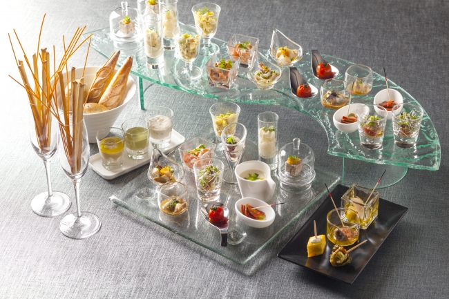 着席と共にお持ちするグリッシーニやディップなどのアミューズブーシュをお楽しみいただきながら、メインメニューをお選びいただきます。その後、冷菜や温物、スープなどバラエティ豊富に揃えるタパスサイズの前菜をお届けいたします。常時15種類前後ご用意するTapa-tizers タパタイザーを1品ずつ順にご提供いたしますが、もう一つ追加で食べたい場合は、スタッフにお声掛けいただければテーブルまでお持ちいたします。まさにいつまでも尽きることなくお楽しみいただける前菜サービスです。