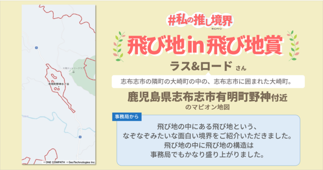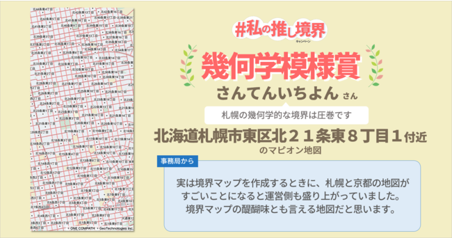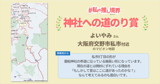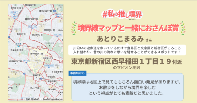 凸版印刷株式会社のグループ会社である株式会社ONE COMPATH(ワン・コンパス)が運営する地図アプリ「地図マピオン」(iOS版)は、2022年8月1 日(月)〜8月31日(水)までに開催したTwitter投稿キャンペーン「#私の推し境界」キャンペーンの結果を発表します。投稿いただいた作品の中から厳正な選考の結果、5賞7境界を選出しました。