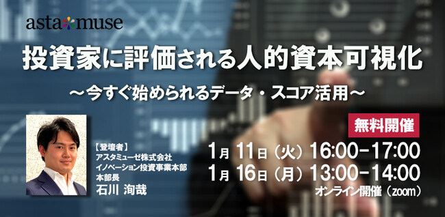 アスタミューゼ株式会社(本社:東京都千代田区、代表取締役社長 永井歩)は、2023年1月11日(火)16:00〜17:00、および1月16日(月)13:00〜14:00に経営企画部、人事部、サステナビリティ部署、その他人的資本経営やIR開示に関わる業務に携わる方を対象とした無料ウェビナー「投資家に評価される人的資本可視化〜今すぐ始められるデータ・スコア活用〜」を開催いたします。