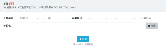 例)学歴記入部分:追加ボタンで追加可能です。中学校卒業から入力してください。