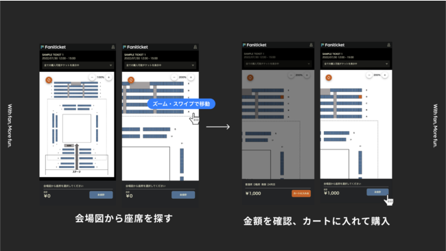 今までのFaniconチケットでは、座席番号や整理番号を購入後に割り振る機能のみがご利用可能でしたが、「スポーツ観戦のチケットを販売したい」「ファンクラブの会員様に先行で好きな席を購入していただきたい」という声が多く寄せられました。そこで、様々な利用ケースに対応したいという想いから、スポーツ観戦やコンサートホールのチケットなどで主流となっている「座席指定の購入方式」を取り入れました。今回の機能アップデートにより、チケット販売ページにてファンが会場図を見ながら、お好きな座席を事前に選択してチケットを購入できるようになりました。今後も、Faniconチケットをご活用いただき、様々な推し活の形をお楽しみいただけますと幸いです。