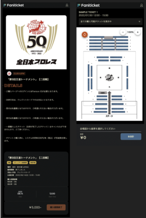 Faniconをご利用いただいている全日本プロレス様に、今年8月開催予定の「第9回王道トーナメント【二回戦】」にて、ファンコミュニティ会員限定のチケット先行販売にご利用いただきました。会場図の画像を今回開発した解析ツールで読み取り、座席と画像上の座標を紐付けることで、ファンの皆さまが会場図を見ながら座席を購入できるようにいたしました。