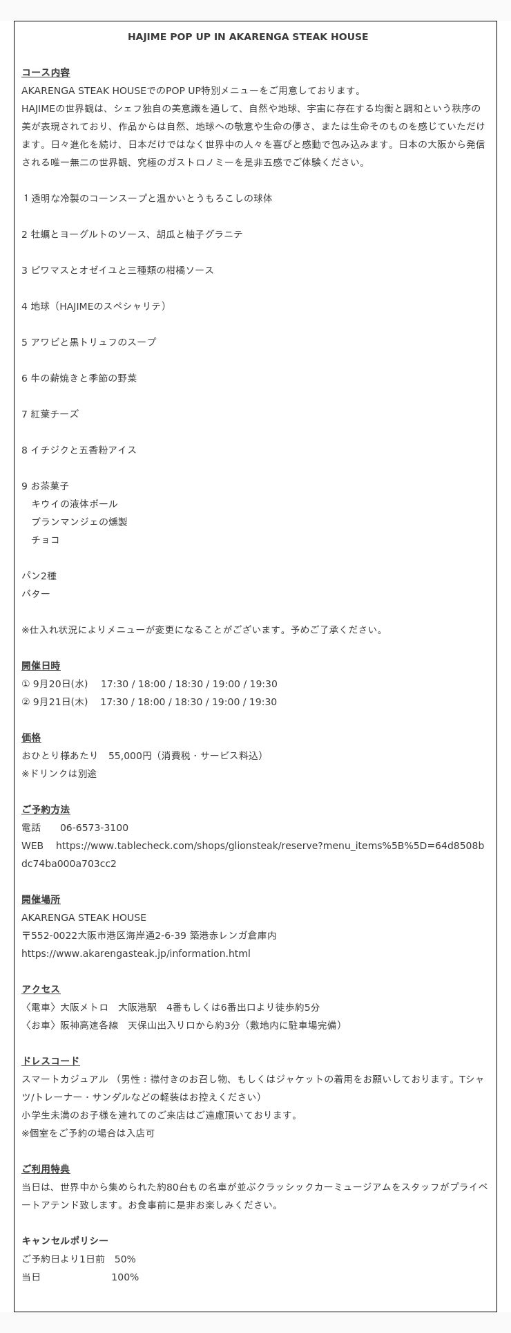 AKARENGA STEAK HOUSEがございます大阪・築港赤レンガ倉庫は1923年に建てられ、今年2023年で築100年を迎えました。そんな赤レンガ倉庫の100周年を記念し、この度世界最短でミシュラン三ツ星を獲得した【HAJIME】のPOP UPイベントの開催がGLION MUSEUM内AKARENGA STEAK HOUSUEにて決定致しました。