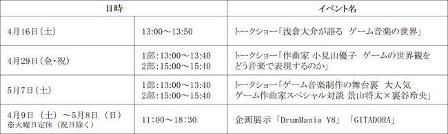 「GAME×MUSIC」では、これまで数々のゲーム音楽を手掛けてきた浅倉大介さん(音楽プロデューサー、作・編曲家)、小見山優子さん(作曲家)、景山将太さん(作・編曲家、サウンドプロデューサー)と裏谷玲央さん(作曲家)のトークショーや、2011年製のKONAMIのアーケードゲーム「DrumMania V8」などが体験できる企画展示を行います。