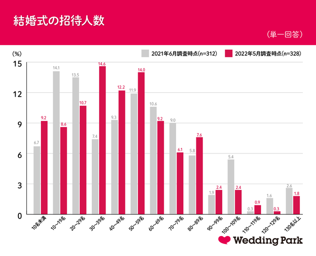 「現在検討している結婚式の人数規模を教えてください(単一回答)」と質問したところ、全体の69.3%が「60名未満」での実施を検討していることがわかりました。特に30名〜59名の割合が2021年6月の調査と比べ40.8%にまで増加しており、10名〜29名の割合が多かった緊急事態宣言下(2021年6月)と比べ招待人数は微増傾向にあることがわかりました。