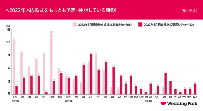 一方で、調査時点で結婚式場を検討している方の実施検討時期は「2023年1月〜12月(53.7%)」と、結婚式場を検討している方の過半数は2023年の実施を検討していることがわかりました。また、「2024年1月〜12月(19.8%)」と、約2割は2024年の実施を検討しており、先々の結婚式実施を視野にいれた式場探しをおこなっていることがわかりました。