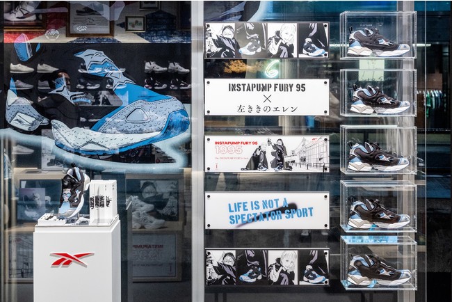 今回のコラボレーションでは、キャンペーンと同日発表となる、リーボックの代表モデルである「INSTAPUMP FURY 95」の“サックスブルー”の発売を記念し、かっぴー先生による完全描き下ろしの巨大ウィンドウアートや、原作と連動したストーリーのオリジナル漫画がリーボック クラシックストア原宿店、リーボック公式Twitterにて公開します。さらに、リーボックストア クラシックストア原宿店、リーボックストア渋谷店を『左ききのエレン』がジャック!原宿店の巨大ウィンドウアートだけでなく、各店内にも『左ききのエレン』の漫画やグラフィックが施され、漫画の世界観にどっぷり浸れること間違いなしです。