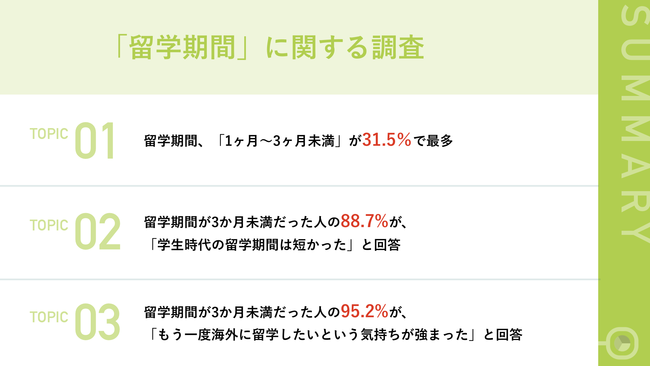 まずは、留学経験者の約6割が、「3ヶ月未満」の短期留学であることがわかりました。短期留学に対する満足度については、79.0%が「満足している」と回答。その反面、留学期間については、「短かったと思う」との回答が88.7%を占めました。結果として、95.2%が「もう一度海外へ留学したいという気持ちが強くなった」こともわかりました。短期留学に関しては、「旅行のような感じで気軽に参加できた」、「期間は短かったが良い人生経験になった」などの声が感想として挙がりました。