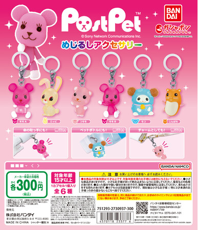 株式会社バンダイ ベンダー事業部(本社:東京都台東区)は、平成を代表するキャラクターで、今なおファンに愛され続けている「愛玩電子メールソフトPostPet」から「ポストペット めじるしアクセサリー」(1回 300 円・税10%込、全6種)を2024年7月第1週から順次、全国のガシャポンバンダイオフィシャルショップ、玩具売り場・量販店・家電店などに設置されたガシャポン自販機シリーズにて発売いたします。
