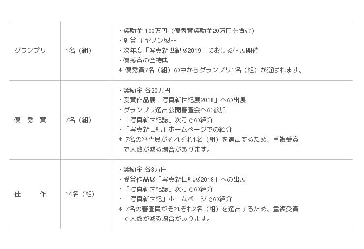 グランプリ受賞者には、奨励金100万円と副賞のキヤノン製品のほか、特典として次年度の受賞作品展における個展開催の権利などを授与します。また、優秀賞と佳作の受賞者には奨励金と本年度の受賞作品展への出展などの権利を授与し、受賞者の今後の創作活動を奨励します。