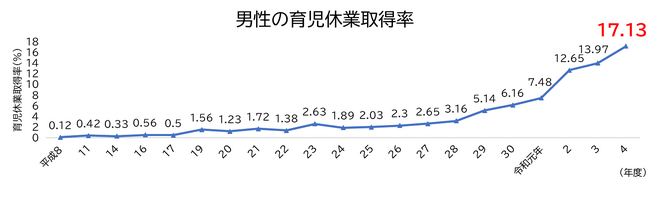 また、厚生労働省「令和4年度雇用均等基本調査」における男性の育休取得率は、17.13%という結果となりました。