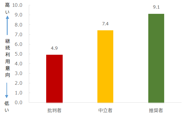 対象の人材派遣会社において今後の継続利用意向を、0〜10の11段階でたずねたところ、「推奨者」 (推奨度が「9」〜「10」の回答者)は平均9.1ポイント、「中立者」 (推奨度が「7」〜「8」の回答者)は平均7.4ポイント、また「批判者」 (推奨度が「0」〜「6」の回答者)は4.9ポイントとなり、推奨度が高いほど、継続利用意向が高くなる結果となりました。