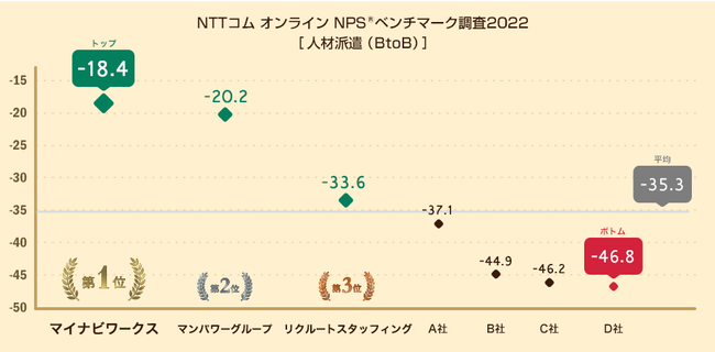 人材派遣業界を対象とした顧客企業向け(BtoB)のNPS(R)ベンチマーク調査2022の結果を発表。NPS(R)1位はマイナビワークス