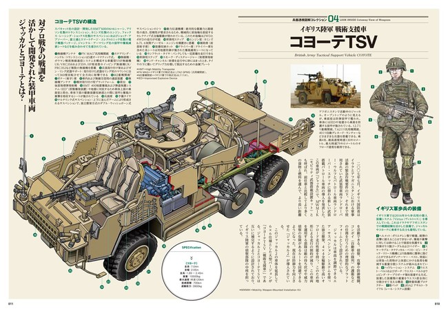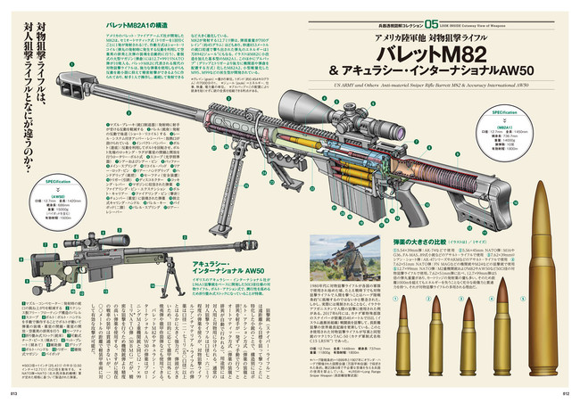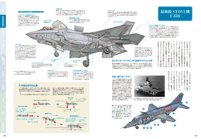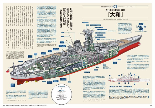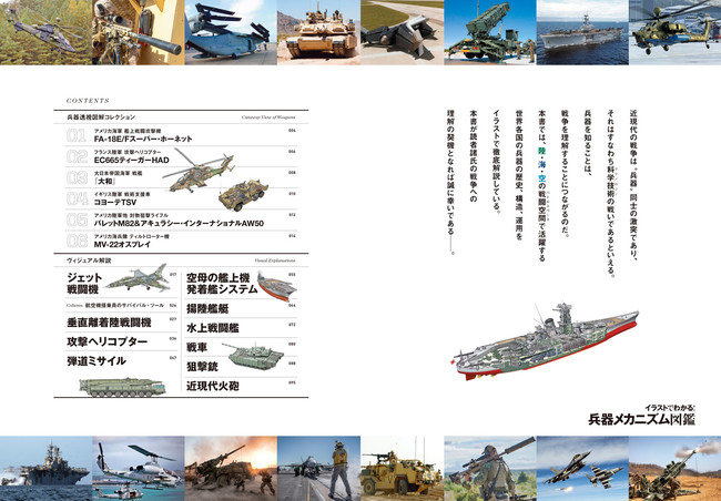 本書では主要な兵器9種、具体的には以下の兵器を扱っています。1.ジェット戦闘機、2.垂直離着陸戦闘機、3.攻撃ヘリコプター、3.弾道ミサイル、4.空母の艦上機発着艦システム、5.揚陸艦艇、6.水上戦闘艦、7.戦車、8.狙撃銃、9.近現代火砲。 また巻頭には、米軍のジェット戦闘機FA-18E/Fスーパー・ホーネット、戦艦『大和』、ティルトローター機MV-22オスプレイなどの兵器の内部構造がわかる見開き大の特大透視図解イラストを掲載した「透視図解コレクション」のパートを設けています。
