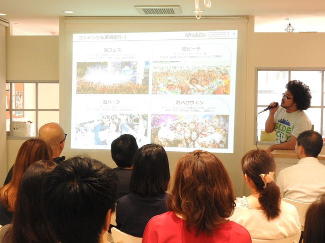 続いて、特別ゲスト講師として、当協会のアンバサダーであり、泡にまみれて踊る音楽イベント「泡パ(R)」を始め、話題の体験型コンテンツを仕掛けるパーティークリエイター「アフロマンス」氏が登壇。これまでにアフロマンス氏が手掛けた事例を交えながら、拡散に繋がる「言葉の使い方」や参加者のロイヤリティを高める「コンテンツの作り方」など、イベント企画のテクニックを解説いただきました。