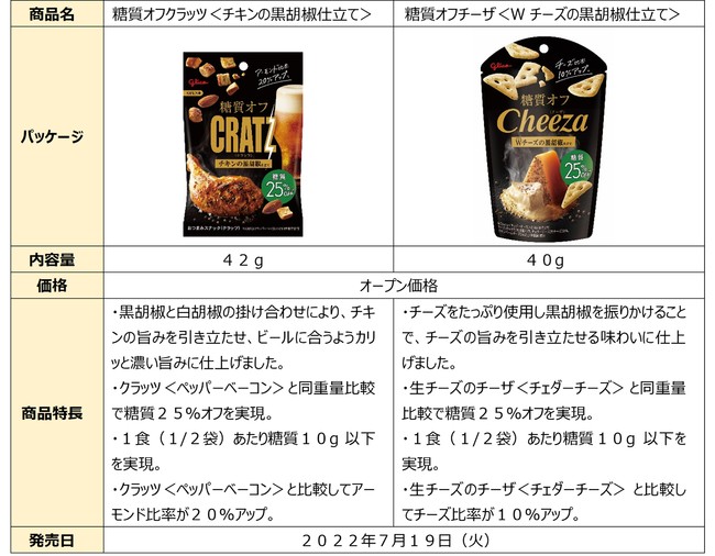 「糖質オフ クラッツ<チキンの黒胡椒仕立て>」「糖質オフ チーザ<Wチーズの黒胡椒仕立て>」7月19日(火)より新発売