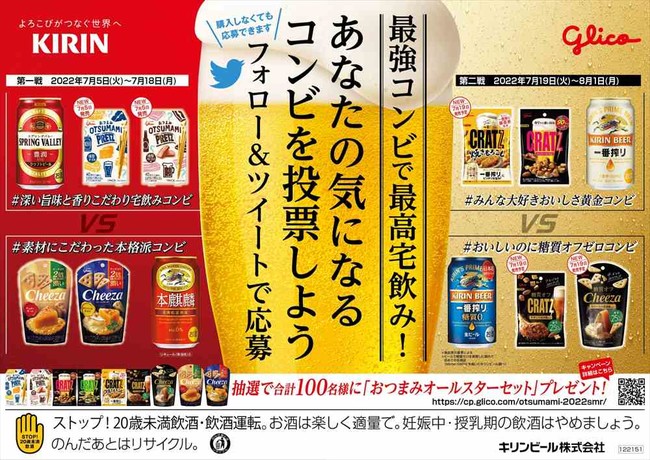 「糖質オフクラッツ」「糖質オフチーザ」他、Glicoこだわりのおつまみブランドと、キリンビール株式会社の人気商品がコラボレーションした「最強コンビで最高宅飲み!あなたの気になるコンビを投票しよう」twitterキャンペーンを実施します。応募期間中、「クラッツ」公式twitterアカウント(@Cratz_JPN)をフォローし、指定ハッシュタグとその応募期間に該当する、気になるGlicoおつまみ商品とキリンビール株式会社のお酒のコンビを選んで投稿して応募してください。投稿数の多いコンビに対して応募いただいた方の中から抽選で100名様に、Glicoの人気おつまみ商品を詰め合わせた、「おつまみオールスターセット」をプレゼントします。