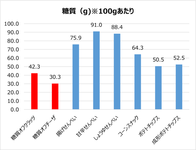 *¹ 「糖質オフクラッツ」と「クラッツ<ペッパーベーコン>」、「糖質オフチーザ」と「生チーズのチーザ<チェダーチーズ>」を同重量で比較